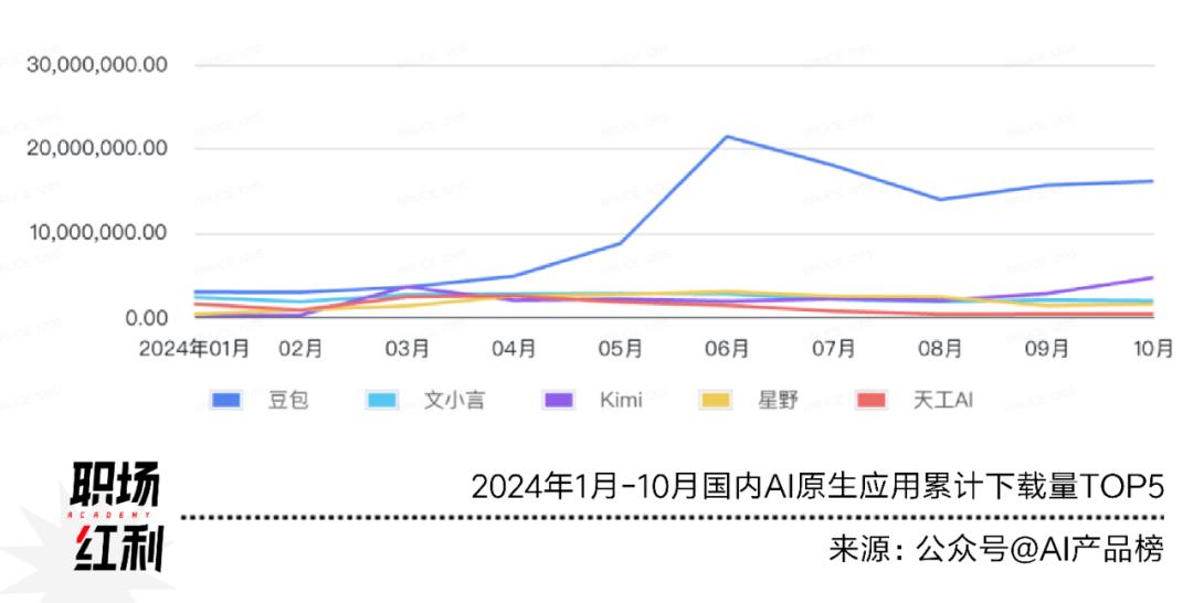 Kimi出厂就高举“长文本”的旗帜,瞄准打工人的使用需求,率先收揽了一大波流量,MUA(月活)长期位于AI产品榜榜单前3。后起之秀豆包,得益于抖音的精准分发能力,其拉新能力相较于其他APP断崖式领先。