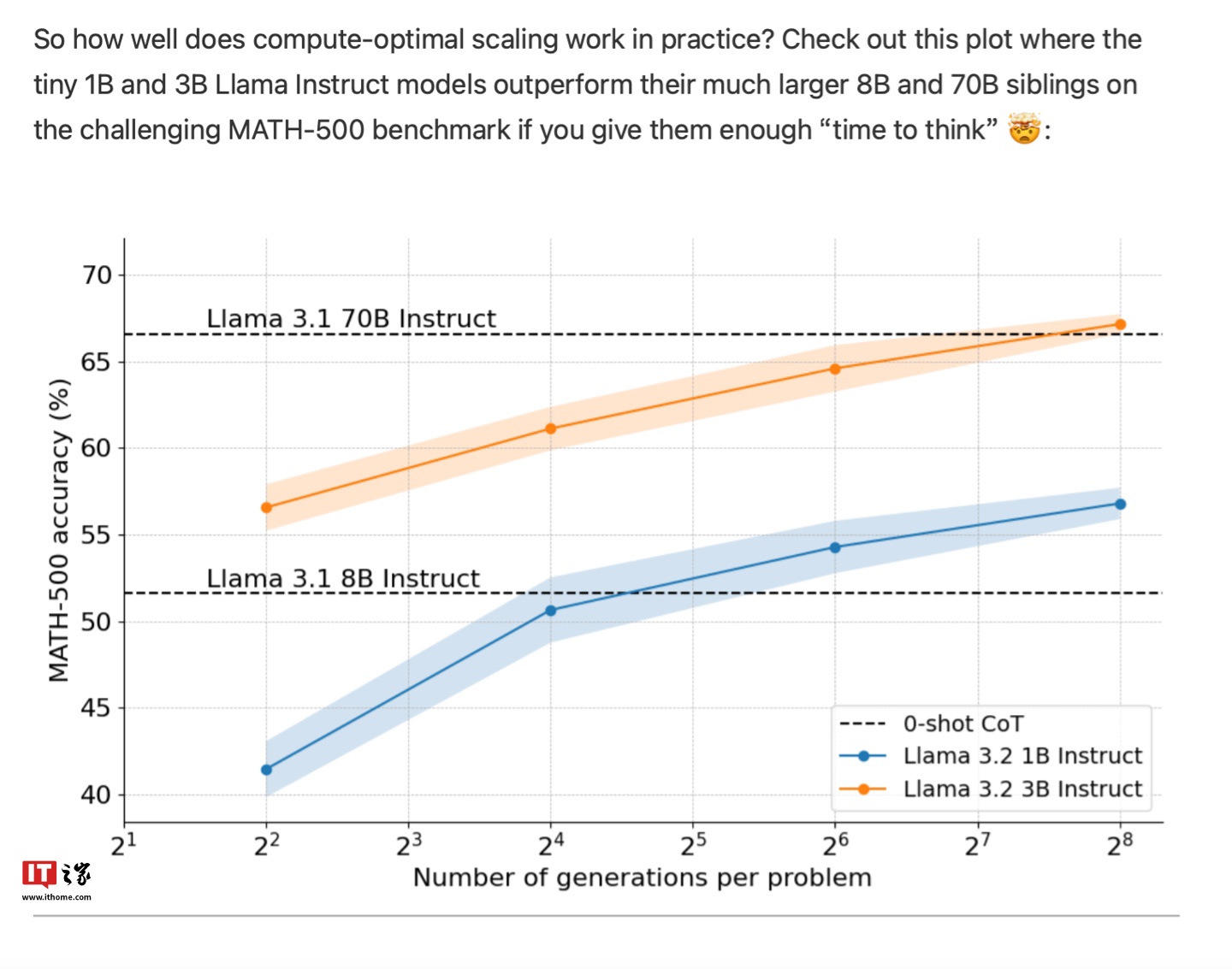 Hugging Face 团队表示,他们使用这种方法利用 10 亿参数的 Llama 模型进行数学基准测试,据称在某些情境下超越了参数量高达 70 亿的大型模型,证明了用时间提升模型输出内容效果做法可行。
