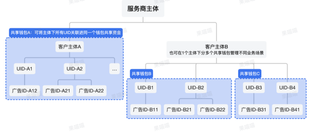 共享钱包是一款多账户资金管理工具。简言之,同个服务商或商家的广告账户可以关联同一个共享钱包,共同使用一个资金池,还包括赔付金、赠款等可灵活调用的资金等,省去优化师频繁转账的流程。