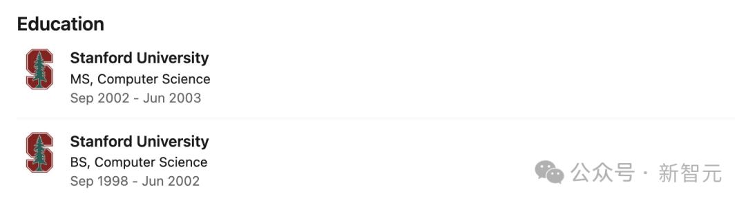 他曾在2002年和2003年分别获得了斯坦福大学的计算机科学学士学位和硕士学位。