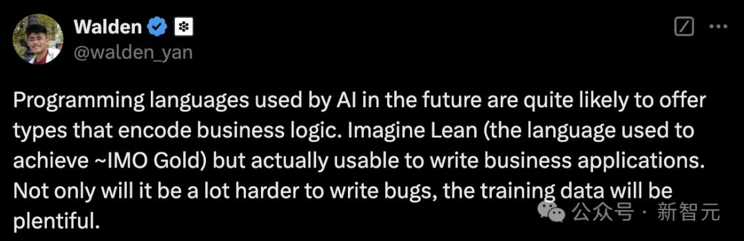 设想一下达到IMO金牌水平的语言Lean,实际上可以用来编写商业应用程序。这样不仅会大大降低编写bug的可能性,而且训练数据也会变得丰富。