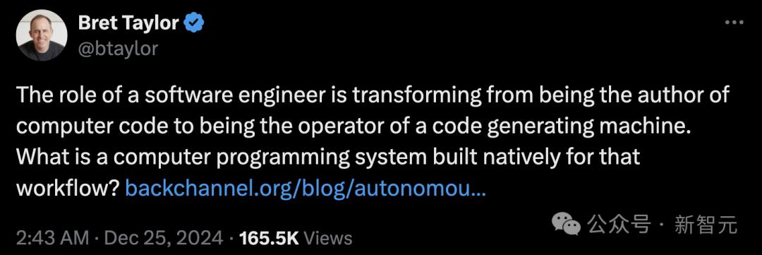 OpenAI现任董事会主席Bret Taylor表示,「软件工程师的角色正在从编写计算机代码的作者,转变为代码生成机器的操作者」。