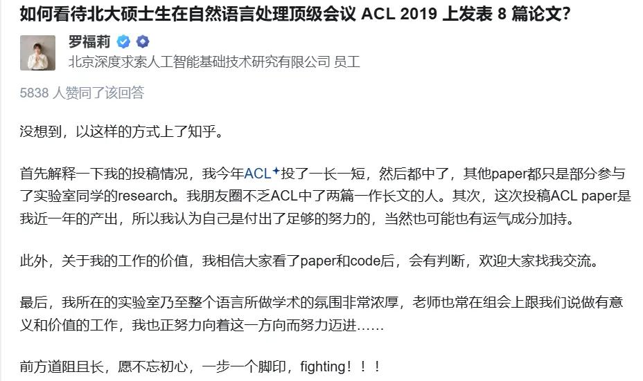 人生转折发生在2019年。身为北大硕士的她,在NLP国际顶会ACL上发表8篇论文(其中2篇一作),迅速登上知乎热搜而走红。