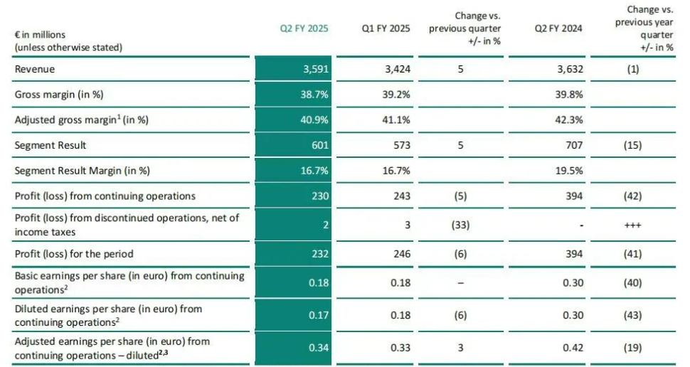 近日,英飞凌发布了2025财年第二季度财报。数据显示,截至2025年3月31日,该季度公司营收达35.91亿欧元,较去年同期下滑1%,利润下降15%至6.01亿欧元,利润率从19.5%降至16.7%。