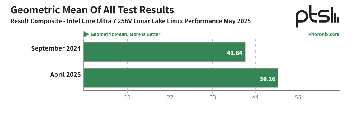数据显示,这款机型的整体性能相较首发时平均提升 20%(而 Arrow Lake 桌面处理器同期提升 6%),图形性能(Xe2 核显)基准测试提升 32%,且 Linux 游戏兼容性获得显著提升。