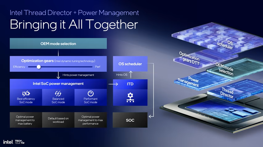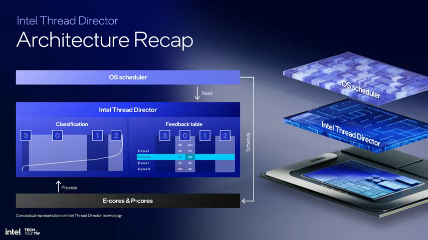 具体来说,低功耗 E-Core 将负责日常任务,从而避免唤醒高功耗模块,而高性能工作则通过混合计算处理,并借助 Thread Director 调度技术在不同核心间高效切换。