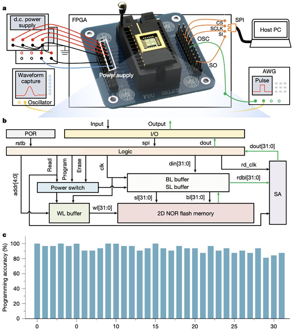 今年4月,周鹏-刘春森团队于Nature期刊提出“破晓”二维闪存原型器件,实现了400皮秒超高速非易失存储,是迄今最快的半导体电荷存储技术,为打破算力发展困境提供了底层原理。