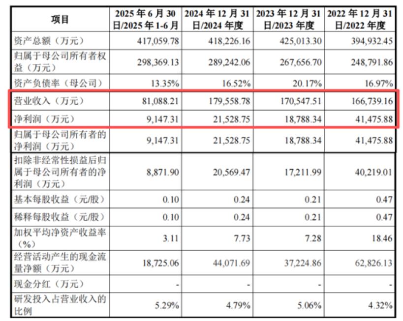 2022年、2023年、2024年和2025年1-6月(报告期),公司营业收入分别为16.67亿元、17.05亿元、17.96亿元和8.11亿元,归属于母公司所有者的净利润分别为4.15亿元、1.88亿元、2.15亿元和9147.31万元,2023年净利润大幅下滑。