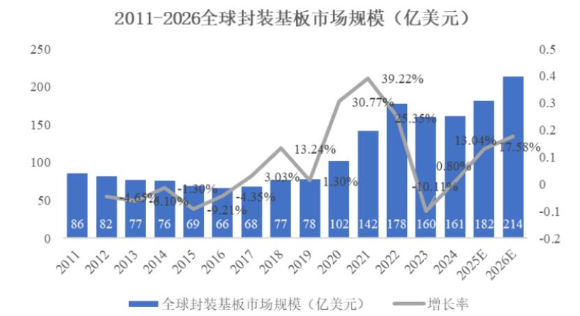 根据Prismark数据显示,全球封装载板市场规模已从2023年的周期性低谷160亿美元实现至2024年的逐渐复苏。