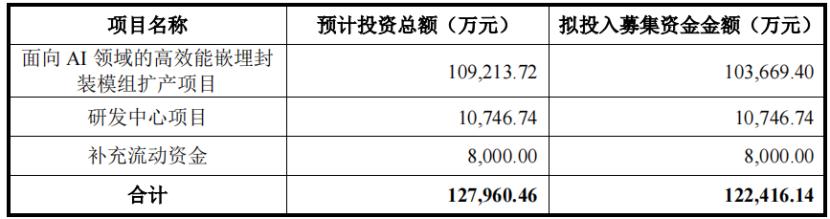 越亚半导体本次募集资金总额为12.8亿元,主要用于面向AI领域的高效能嵌埋封装模组扩产项目、研发中心项目和补充流动资金。