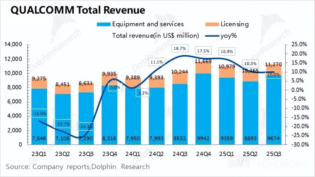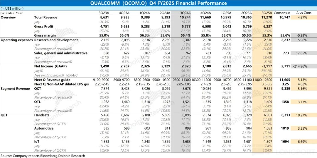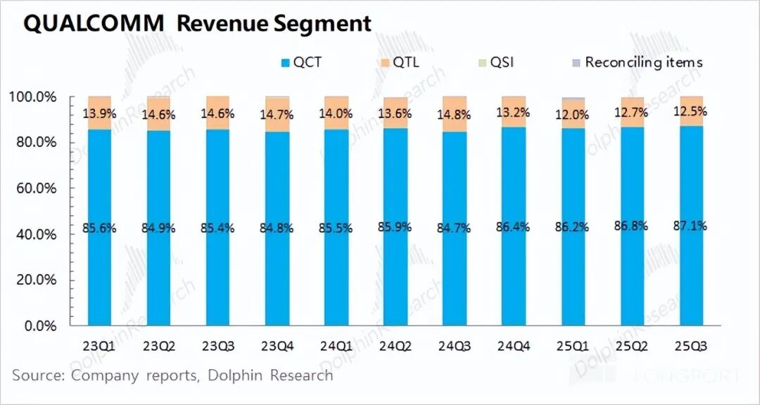 高通在 2025 财年第四季度(即 25Q3)实现营收 112.7 亿美元,同比上升 10%,好于市场预期(107.5 亿美元)。其中 QCT(半导体芯片业务)中智能手机、汽车及 IoT 业务的增长带动,而 QTL(技术许可业务)同比有所下滑。