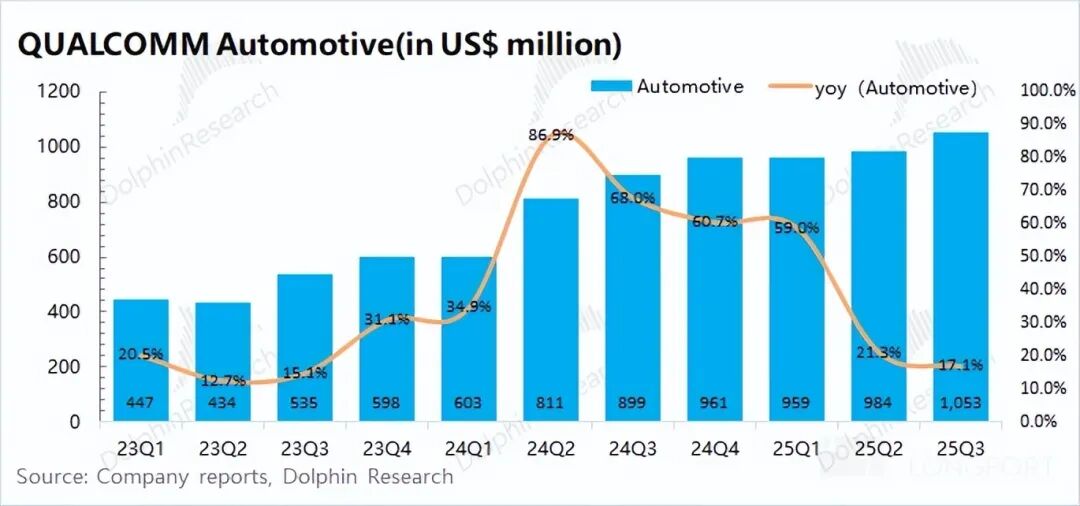 高通的汽车业务在 2025 财年第四季度(即 25Q3)实现营收 10.5 亿美元,同比增长 17%,略好于市场预期(10.2 亿美元),主要是受 Snapdragon 数字底盘出货增加的带动。