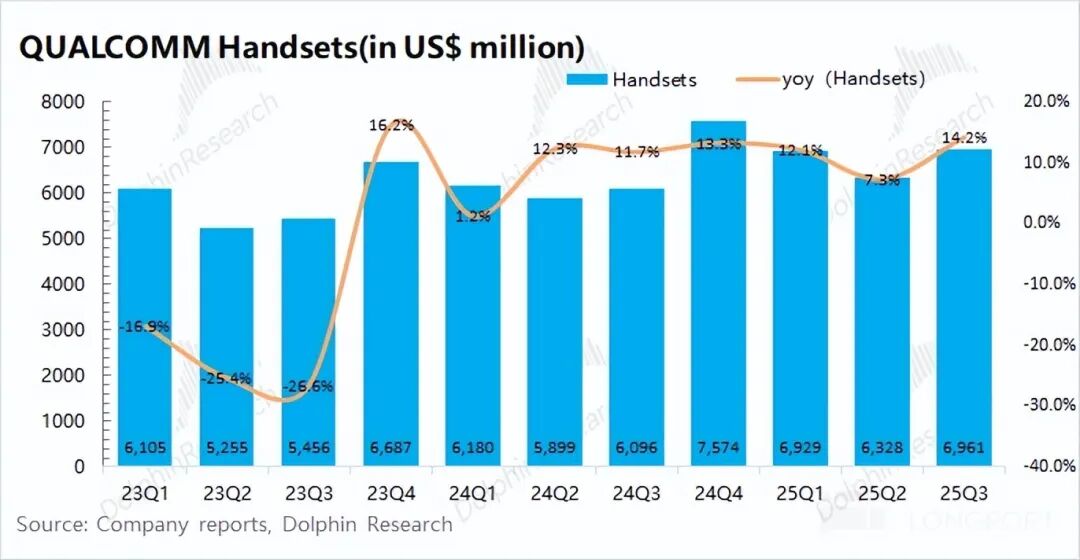 高通的手机业务在 2025 财年第四季度(即 25Q3)实现营收 69.6 亿美元,同比增长 14.2%,好于市场预期(63.1 亿美元)。手机业务超预期,主要来自于今年公司旗舰新品——骁龙 8 Elite Gen5 提前发布的影响。