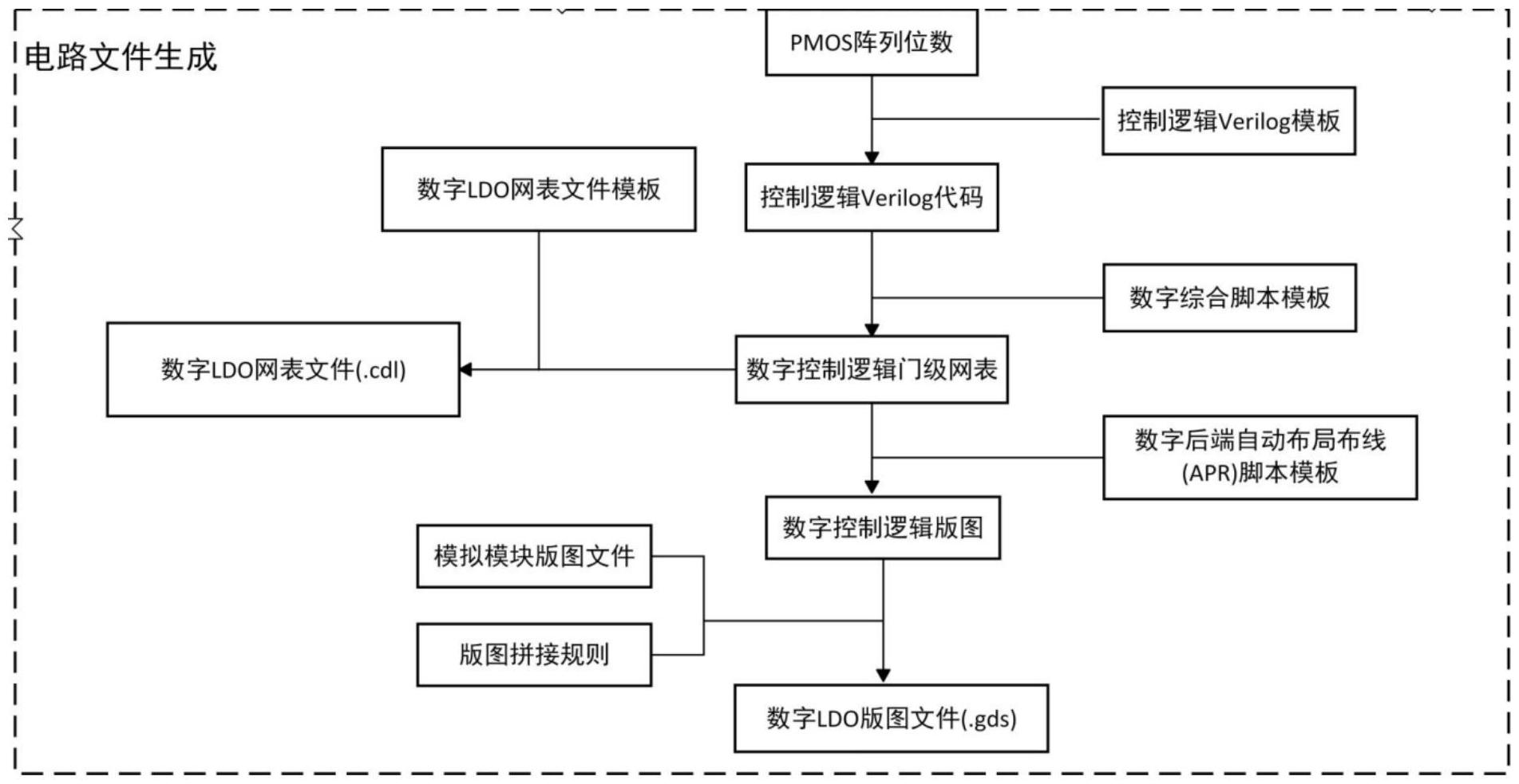 本发明公开了一种可参数化配置的数字LDO自动生成方法及装置,针对现有的数字LDO设计方法需要反复仿真验证和修改原理图版图,周期长成本高的问题,基于给定的数字LDO架构,将数字LDO电路中可改变的设计参数进行配置化设计,将可配置的性能参数与电路设计参数对应起来,只需输入指定的性能参数即可生成对应的数字LDO网表文件和版图文件。大幅减少电路的设计时间,实现敏捷设计。