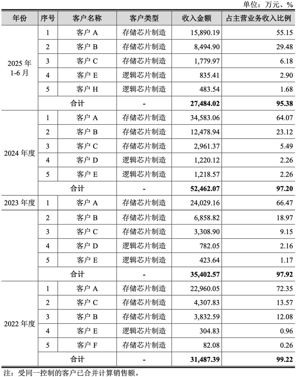 根据弗若斯特沙利文统计,客户A、客户B、客户C、客户D、客户E均为2023年境内产能前十大晶圆厂。客户A、客户B、客户C均为知名存储芯片制造厂商,客户D、客户E等均为知名逻辑芯片生产厂商。
