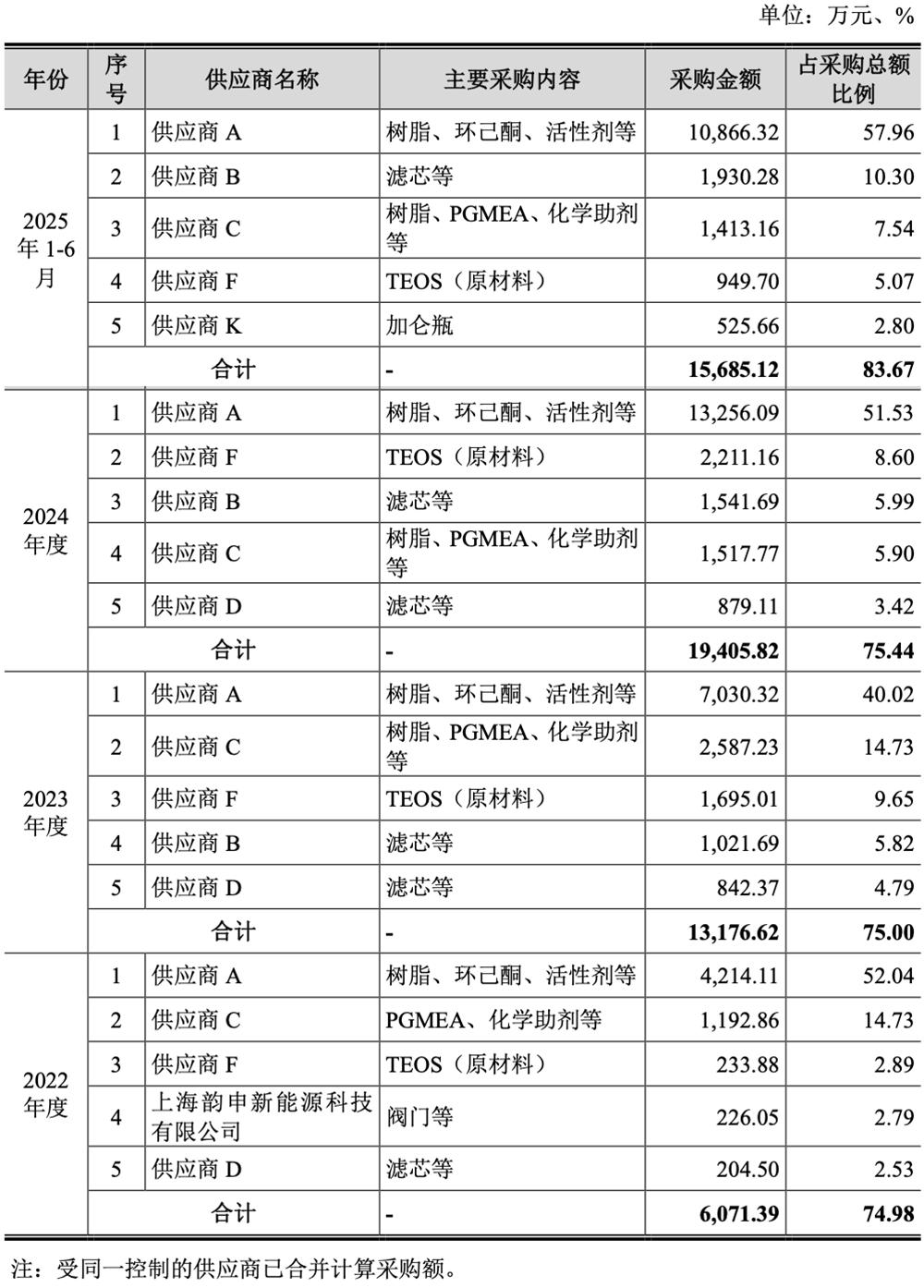 报告期内,恒坤新材原材料采购金额逐年增加,主要原材料仍然通过境外供应商供应,其向前五大原辅料供应商采购金额的占比分别为74.98%、75.00%、75.44%、83.67%,逐年上升。