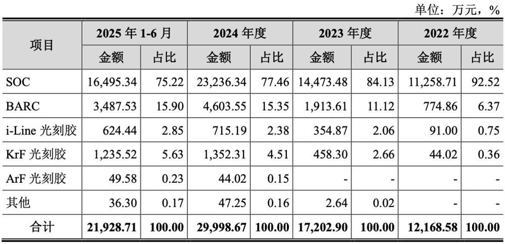 报告期内,恒坤新材自产光刻材料中SOC收入金额占各期自产光刻材料收入的比例均超过75%;BARC于2021年实现销售,i-Line光刻胶、KrF光刻胶于2022年实现销售,并均实现快速增长;ArF光刻胶在2024年开始取得部分收费订单,2025年1-6月已超过去年全年水平。