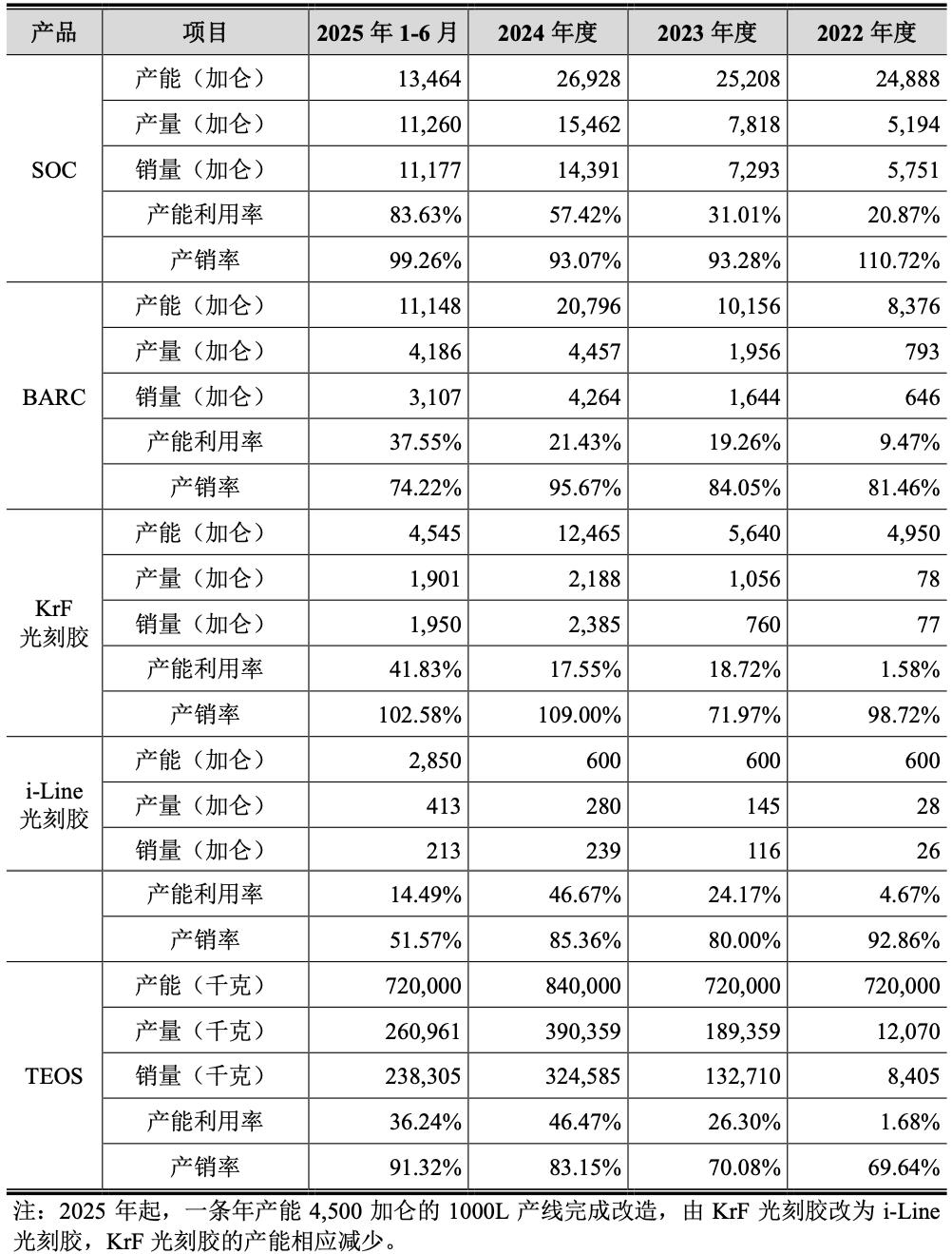 其自产SOC、BARC、KrF光刻胶、i-Line光刻胶、TEOS前驱体材料的产能、产量、销量如下: