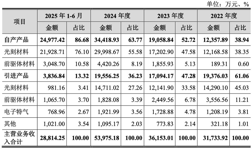 过去三年半,恒坤新材自产产品销售收入分别为1.24亿元、1.91亿元、3.44亿元、2.50亿元,占主营业务收入的比例分别为38.94%、52.72%、63.77%、86.68%,收入和占比逐年增长。