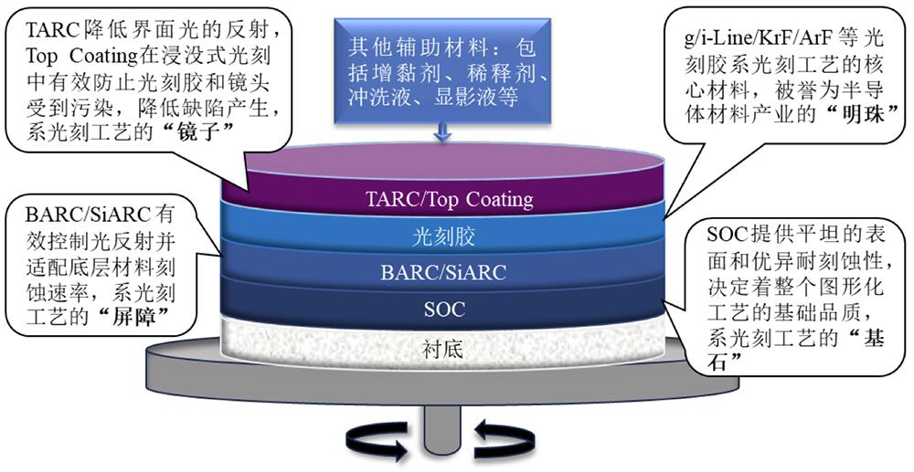 光刻材料贯穿整个光刻工艺,主要包括SOC、ARC、光刻胶、 Top Coating、稀释剂、冲洗液、显影液等,决定着晶圆工艺图形的精密程度与产品良率。