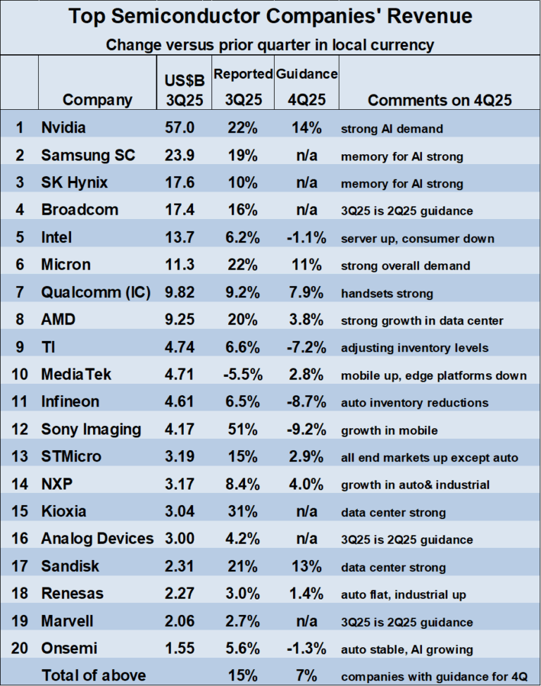 对于2025年第四季度的营收预期,各公司态度不一。在提供 guidance 的14家公司中,9家公司预计营收将增长,增幅从Nvidia的14%到Renesas Electronics的1.4%不等。另有5家公司预计营收将下降,降幅从Onsemi的1.3%到Sony Imaging的9.2%不等。