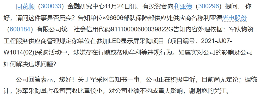 面对危机,利亚德于11月24日回应投资者询问时表示,“关于军采网告知书一事,公司正在积极申诉,目前尚无定论。”公司同时强调,据统计,涉军采购量占其营收比重较小,对整体业绩不构成重大影响。