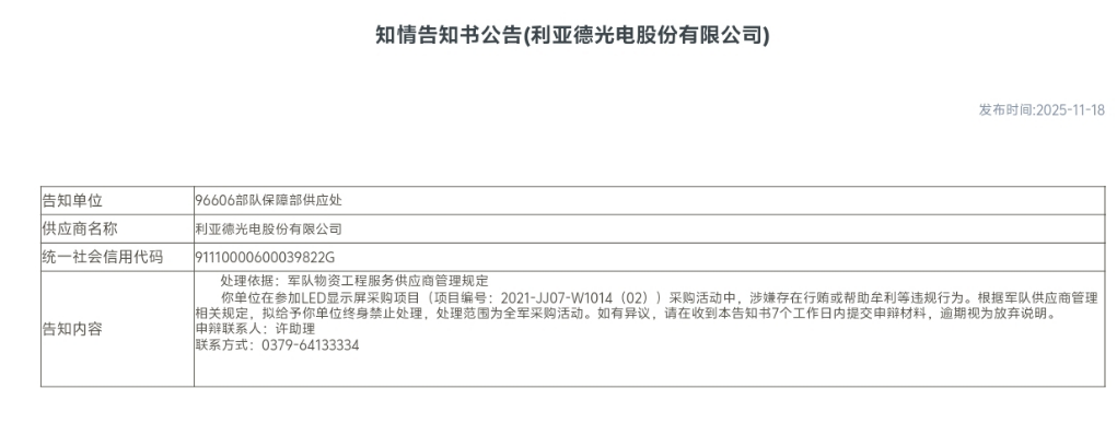 然而,根据96606部队保障部供应处于2025年11月18日发布的《知情告知书公告》,利亚德在该项目中存在涉嫌行贿或帮助牟利等行为,违反了《军队物资工程服务供应商管理规定》,因此面临最严厉的军采市场准入禁令。