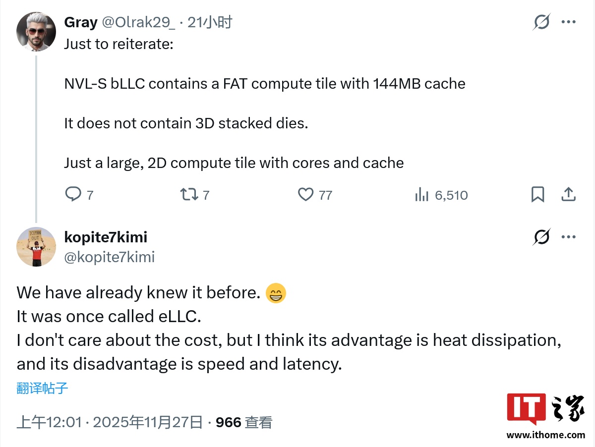 @kopite7kimi 对此进行了回复,称 bLLC 此前一度被称为 eLLC,其设计的优势是散热,但速度和延迟表现则受到影响。