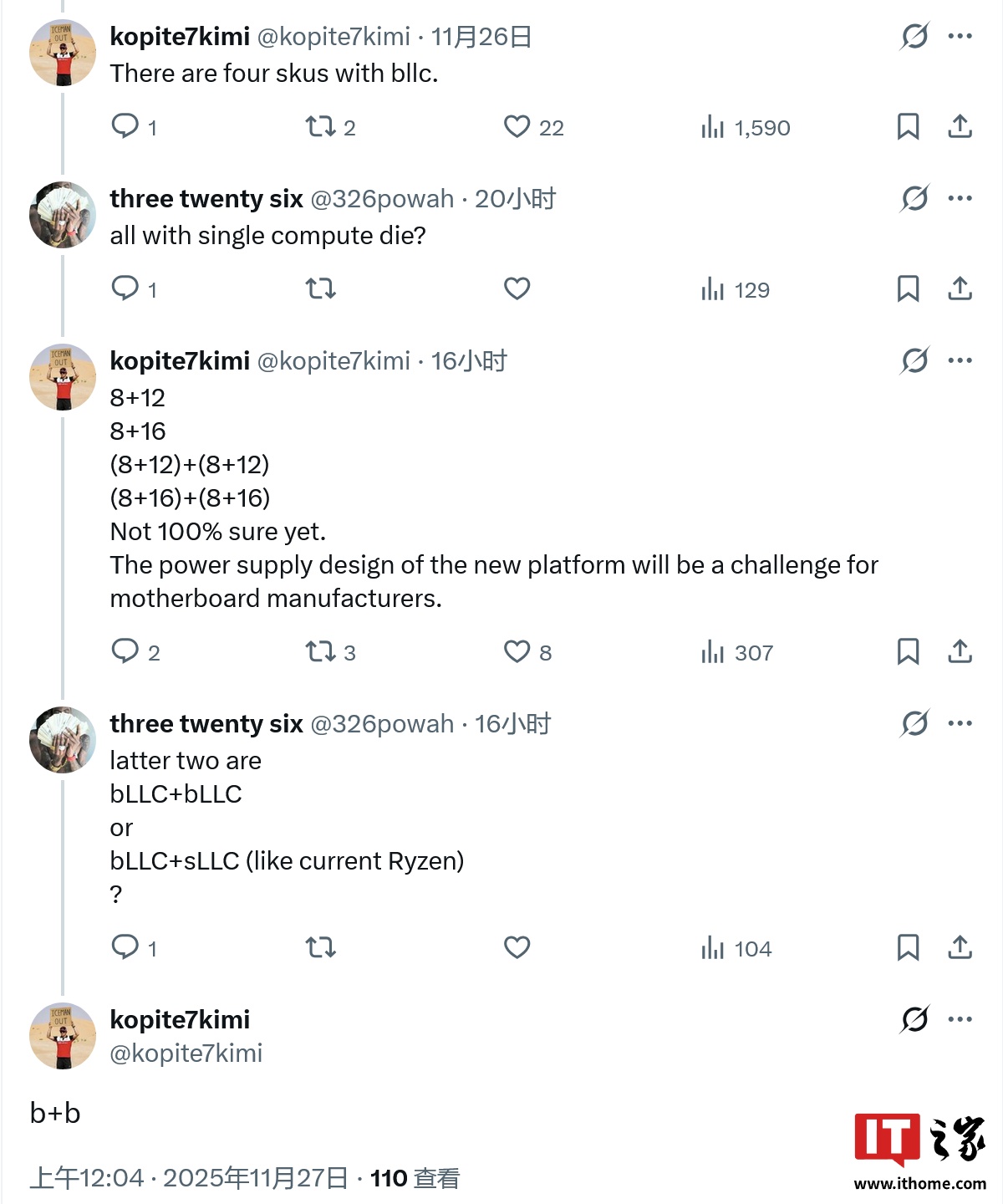 另一位消息人士 @Olrak29_ 就 bLLC 变体的具体设计进行了澄清,bLLC 版本不存在类似 AMD 的 3D 堆叠缓存结构,仅是一个拥有 144MB 缓存容量的更大计算模块(这点其它消息人士也有提及)。