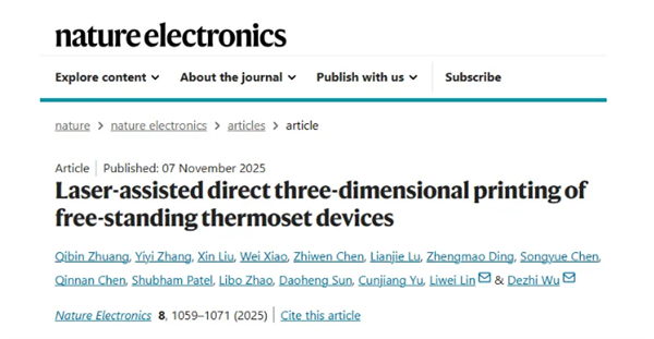 快科技12月1日消息,据报道,厦门大学萨本栋微米纳米科学技术研究院吴德志教授团队在3D打印技术领域实现重要突破——创新提出“激光原位诱导直写打印”技术,将热固性材料三维柔性器件的固化时间从传统工艺所需的数十小时大幅缩短至0.25秒,有效解决了该领域长期存在的成型速度慢、工艺复杂、性能难以精确调控等核心难题。