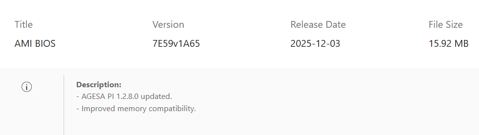 面对新固件潜在的稳定性风险,其他主板厂商也采取了更为谨慎的策略。根据社区维护的 AGESA BIOS 更新表单显示,华擎(ASRock)似乎完全跳过了问题频出的 AGESA 1.2.7.0 版本,直接从旧版 1.2.03 更新至 1.2.8.0,并且其发布的 AGESA 1.2.7.1 版本目前仍处于 Beta 测试阶段。