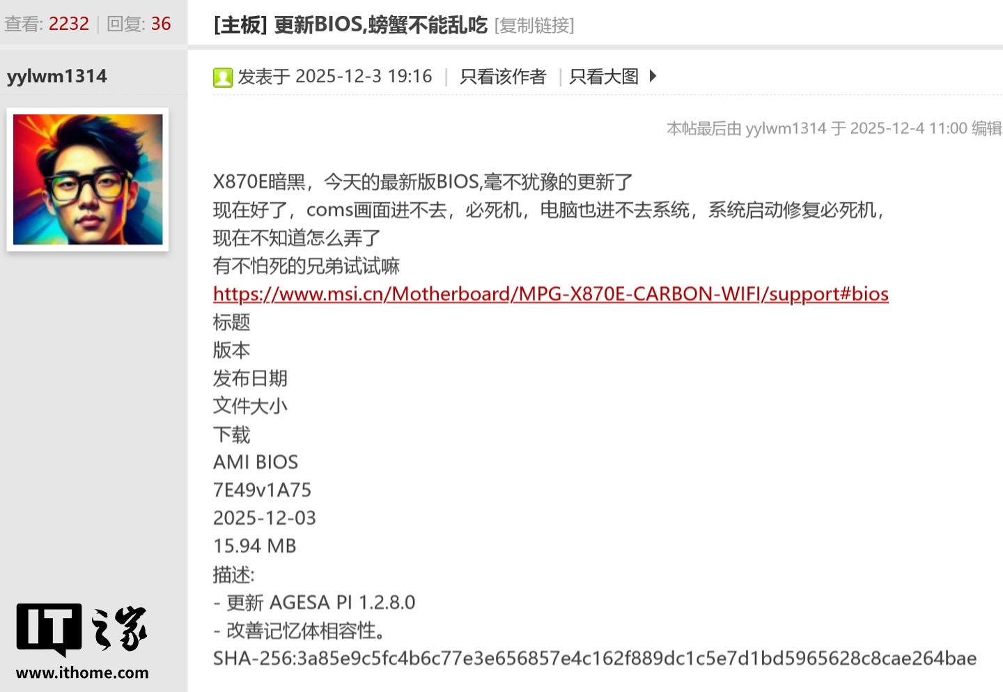 IT之家 12 月 4 日消息,科技媒体 Wccftech 昨日(12 月 3 日)发布博文,报道称微星(MSI)为其 X870E 和 B850 系列主板推送 AGESA 1.2.8.0 版本的 BIOS 固件,不过有用户反馈存在稳定性问题,不仅无法进入操作系统,甚至连 BIOS 设置界面也无法访问,导致系统反复崩溃。