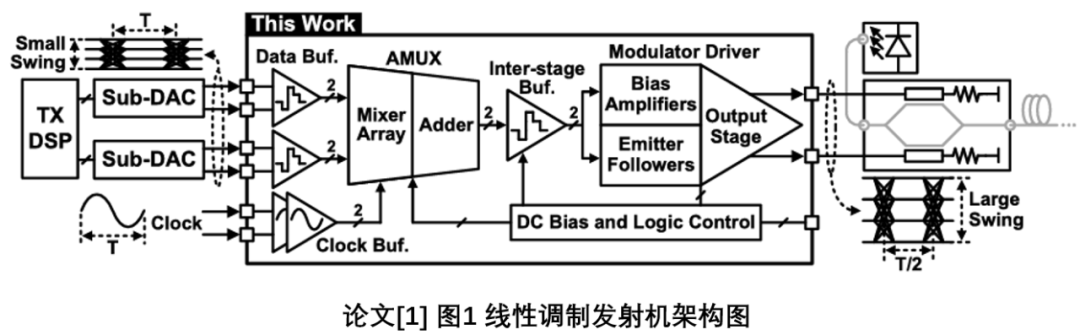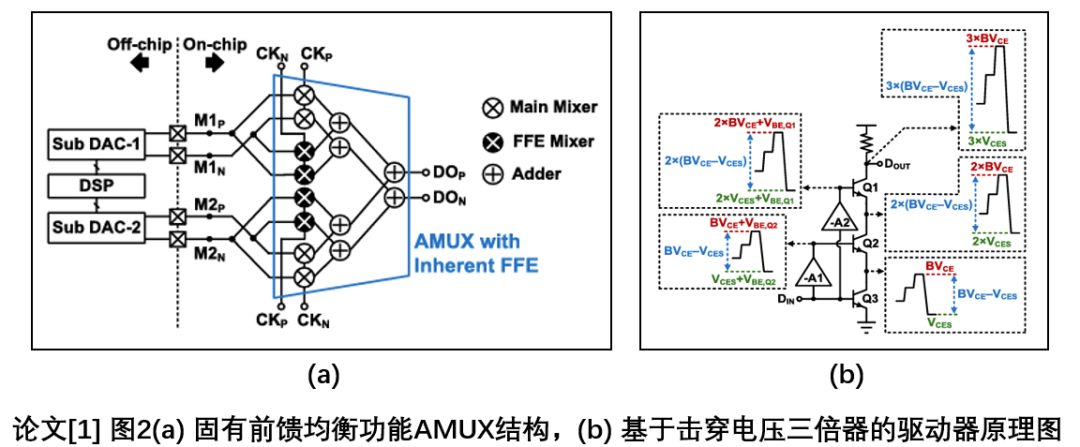 本文提出了一种半速率线性发射机,其单片集成了2选1模拟复用器(AMUX)与用于光学调制器的线性驱动器。该AMUX利用时钟信号与半速率数据流之间的时序关系,实现了一种固有前馈均衡器(FFE)功能,该均衡器可通过调整时钟延迟被重新配置为二抽头或三抽头模式。此外,为提升输出电压摆幅和线性度,本文针对线性驱动器提出了一种名为“击穿电压(BV)三倍器”的拓扑结构。通过堆叠三个异质结双极晶体管(HBT),并利用放大后的输入信号为顶部两个HBT的基极提供偏置,使该驱动器在保持良好可靠性的同时,实现了比传统共源共栅拓扑结构大三倍的输出摆幅。