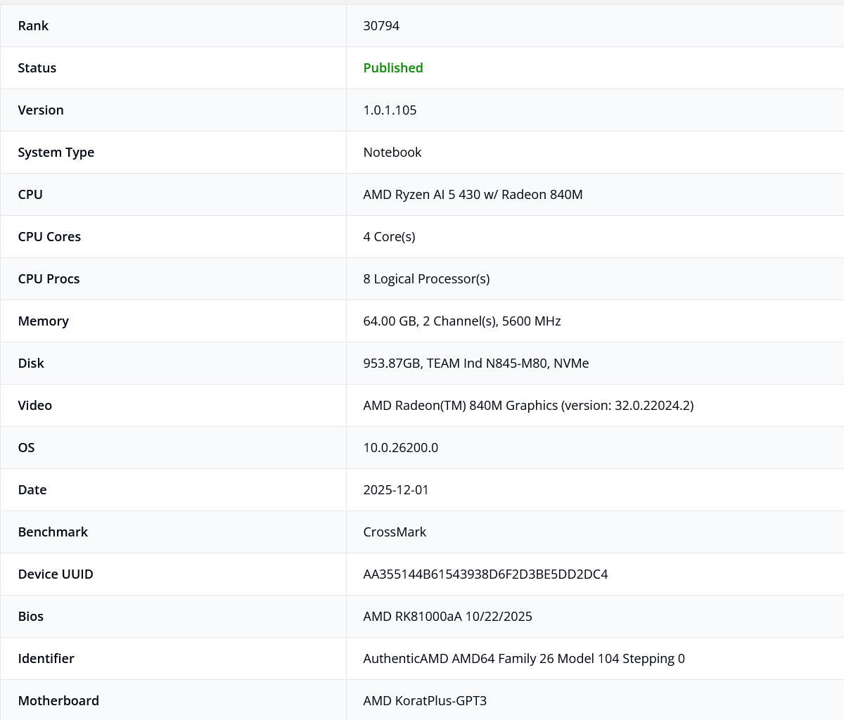 此外,该测试平台的主板型号为 "AMD KoratPlus-GPT3",这里的 "GPT3" 应是 "Gorgon Point 3" 的简写,显示 "Gorgon Point 3" 是 "Krackan Point 2" 的 2026 年 Refresh 版。