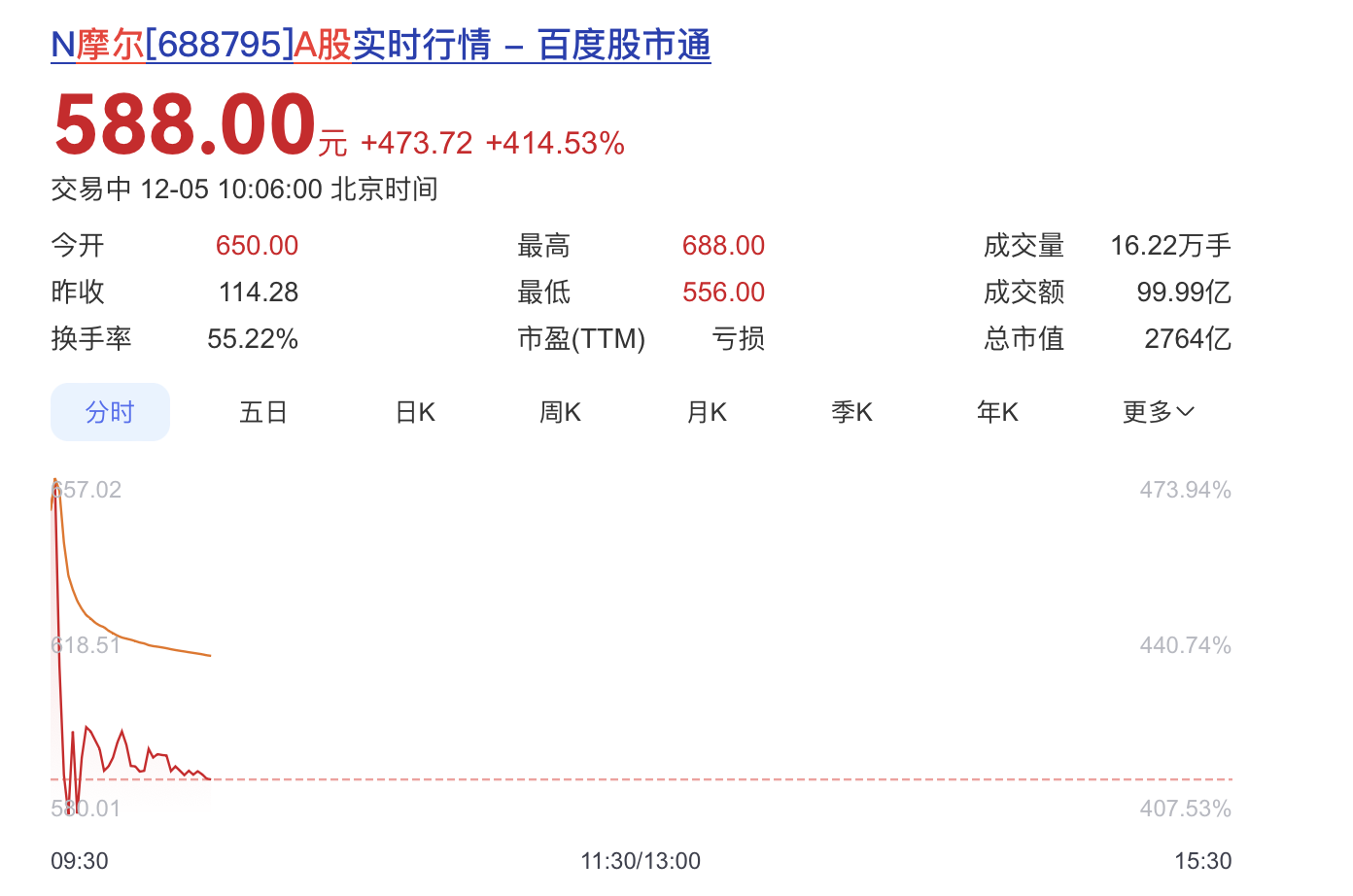 截止发稿,摩尔线程报588元/股,总市值2759亿元。