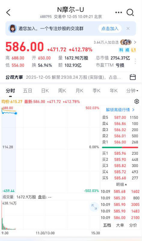 你看这股价,首日一度高开468.78%,开盘价每股650元,市值一度突破3000亿元。