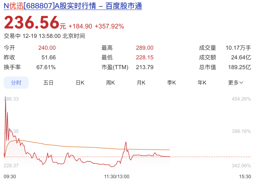 截至发稿,优迅股份股价上涨357.92%,市值189亿元。