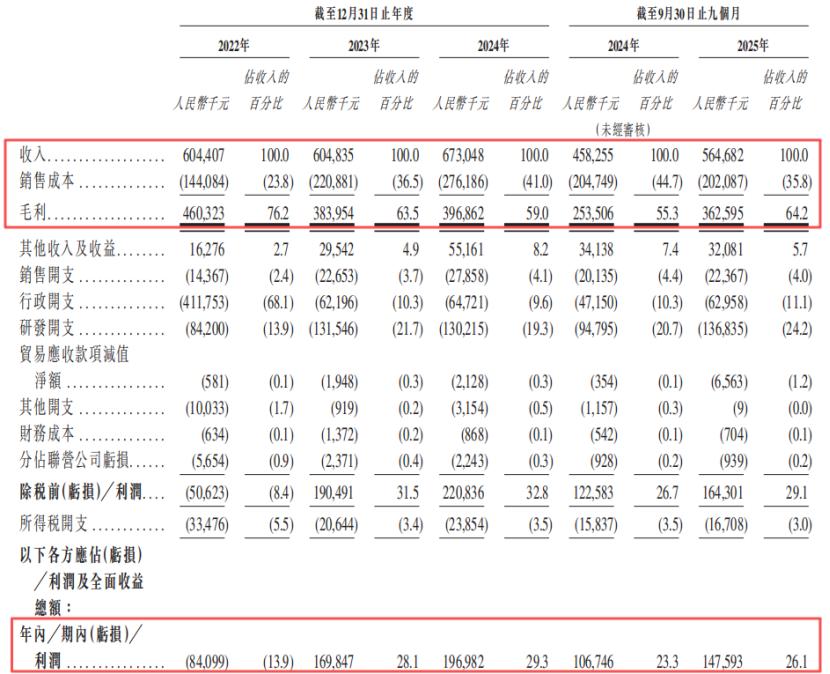 2022年、2023年、2024年及2025年1-9月(报告期),公司的收入分别为6.04亿元、6.05亿元、6.73亿元、5.65亿元,净利润分别为-8410万元、1.7亿元、1.97亿元、1.48亿元。