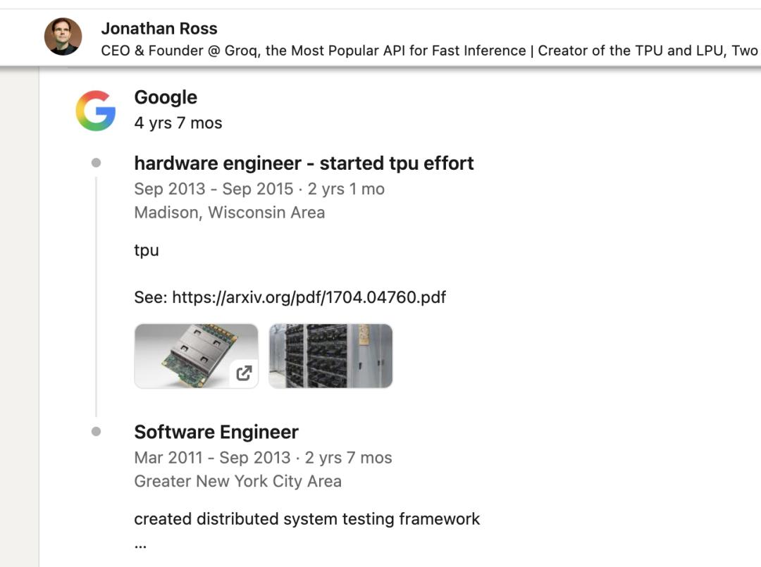 更耐人寻味的是创始人Jonathan Ross的背景。他曾是谷歌张量处理单元(TPU)的核心研发者之一,而TPU正是英伟达GPU在AI领域的主要竞争对手。