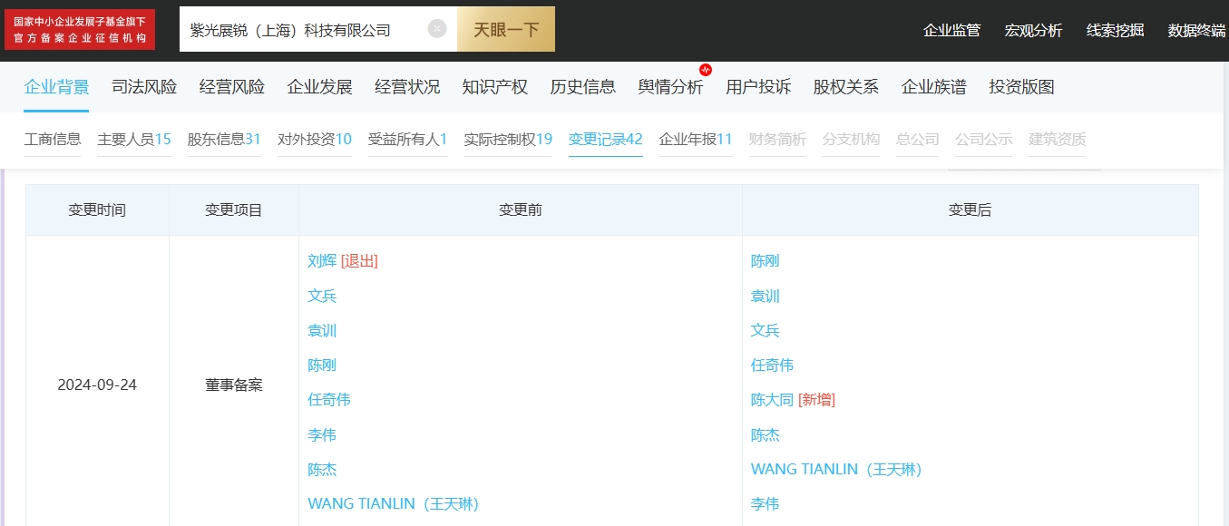 天眼查信息显示,9月24日,紫光展锐(上海)科技有限公司发生董事变更,其中新增展讯通信联合创始人陈大同,原董事刘辉退出。