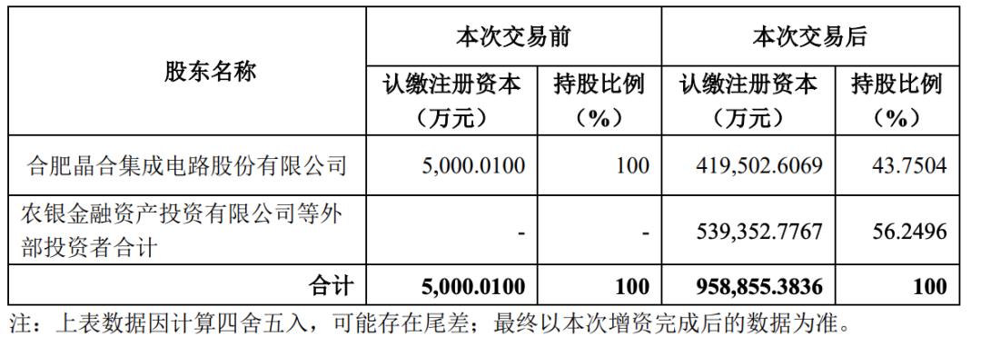 这也是皖芯集成首次引入外部投资。具体来看,本轮融资中,晶合集成拟出资41.5亿元;农银投资、工融金投等外部投资者拟出资54亿元。由此,皖芯集成合计共融资95.5亿元,缔造合肥又一笔超级融资。