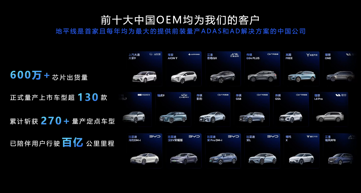 第三,高效的量产交付能力。截至目前,地平线征程家族车载智能计算方案出货量正式突破600万套。前十大OEM均为客户,正式量产上市车型超过130款,累计斩获270+量产定点车型。自2020年开启前装量产以来,地平线征程家族计算方案量产规模持续飙升,在2021年底突破百万大关后,以逐年翻倍的速度,在今年3月达成500万出货,并于数月内再次实现百万增长,持续引领中国智驾计算方案的最大规模量产。不仅证明了其产品的稳定性和可靠性,也使其在成本控制、供应链管理、交付能力等方面积累了丰富的经验。