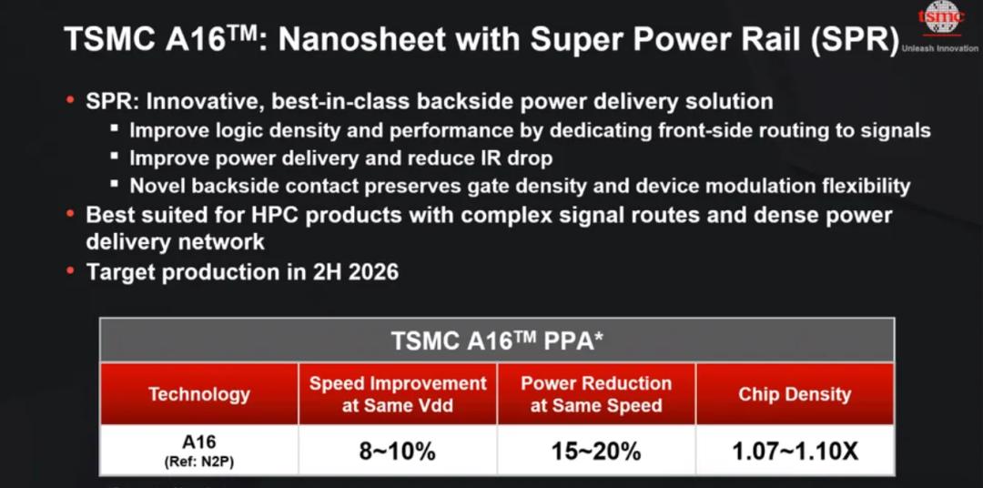 据今年台积电发布会上公开的资料,TSMC A16TM技术将采用领先的纳米片晶体管,并结合创新的背侧电源轨方案,计划于2026年投入生产。