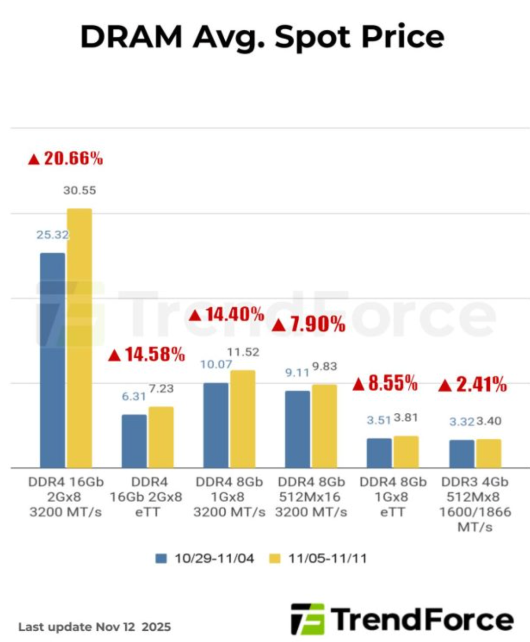 市场研究机构TrendForce预测,2025年第四季度DRAM(包括HBM芯片)的平均价格将较前一季度上涨50%至55%。