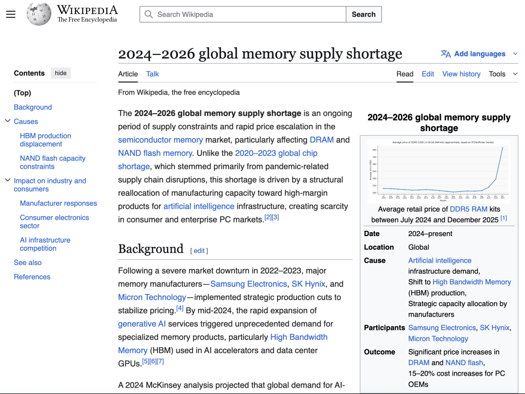 维基百科甚至专门创建了一个词条:2024-2026全球存储短缺!