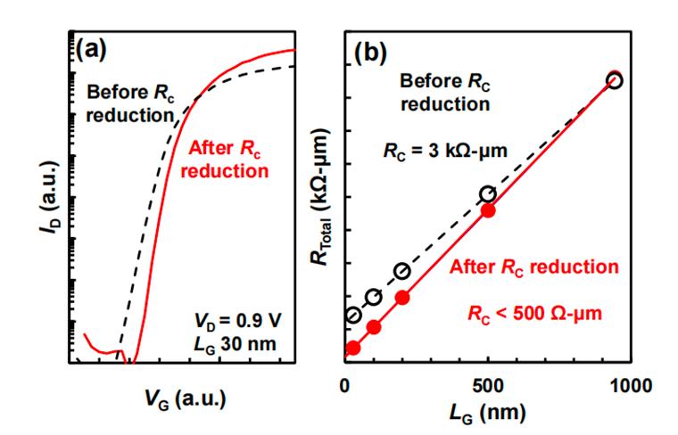 图 3:(a)进行接触电阻(RC)优化前后的 ID–VG 特性对比;(b)通过 TLM 方法提取的 RC 数值,显示经优化后 RC 低于 500 Ω·μm。