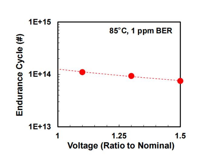 图 6: 1T-1C 存储芯片的耐久性测试结果,在 85 ℃ 条件下经过 10¹⁴ 次循环后,误码率(BER)仍低于 1 ppm。