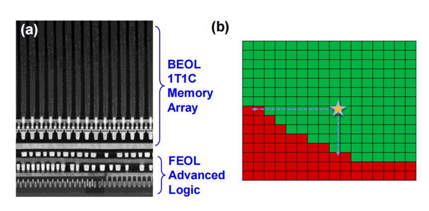 图 1:(a)采用 COP 结构的 BEOL 1T-1C 存储器的截面 TEM 图;(b)1T-1C 存储芯片的 Shmoo 图,显示出良好的性能裕量。