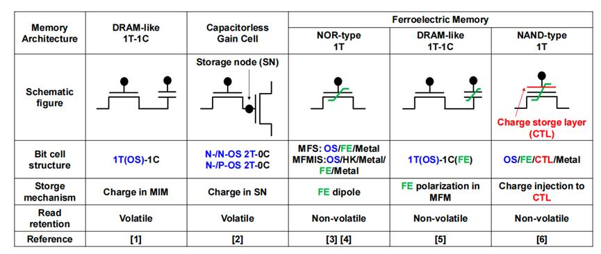 表 I: 基于氧化物半导体(OS)沟道的主要 BEOL 兼容存储器总结