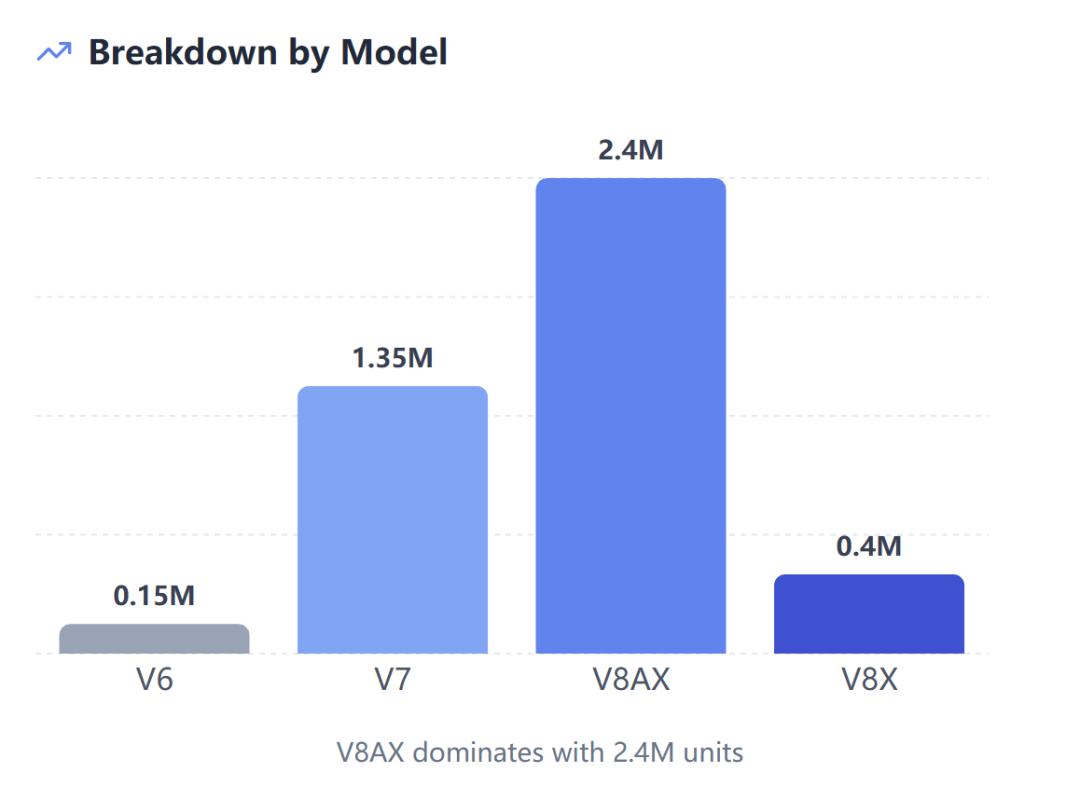其中,V8AX和V8X总计280万颗,占比约65%。